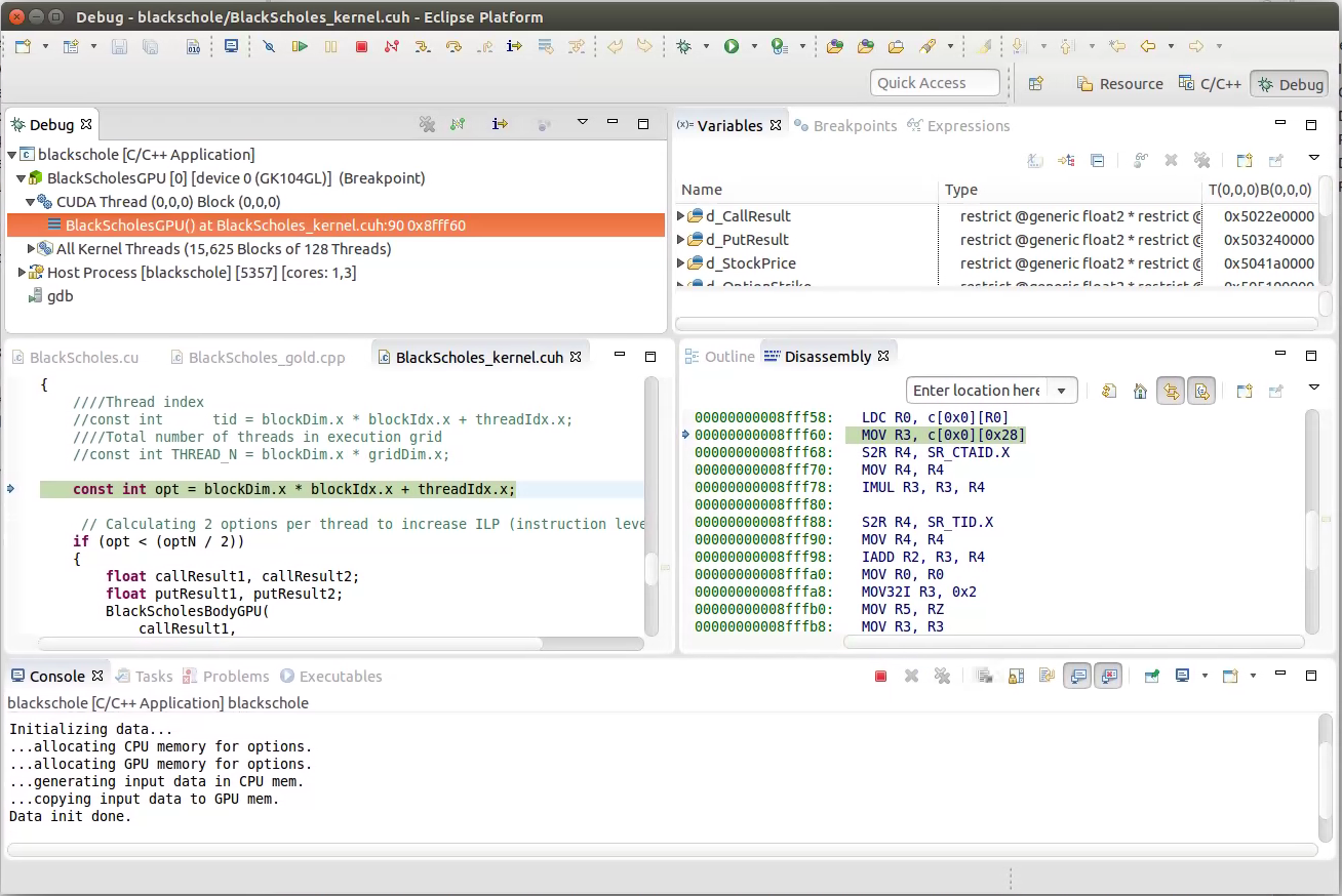 当应用程序到达断点时,调试器将中断。您现在可以检查CUDA设备状态、逐步执行GPU代码或恢复应用程序运行。
