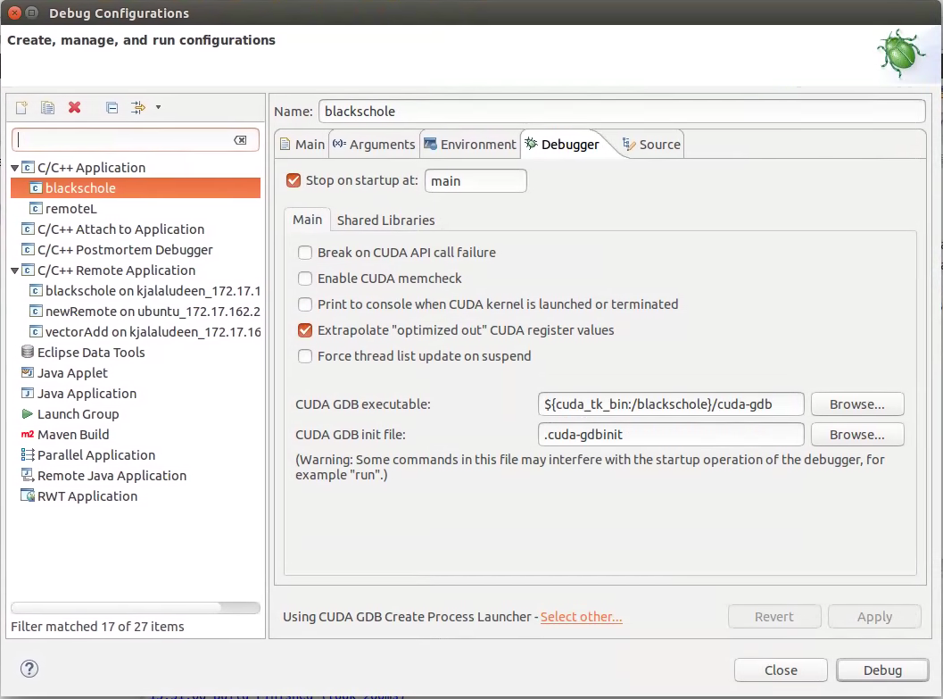 在进行远程调试时,将目标库的副本存放在本地sysroot中会很有帮助。从CUDA 11.5开始,这个功能可以在调试器配置 -> 调试器选项卡中找到。您可以修改'CUDA GDB sysroot (用于远程调试)'指向本地sysroot目录,以提高调试性能。