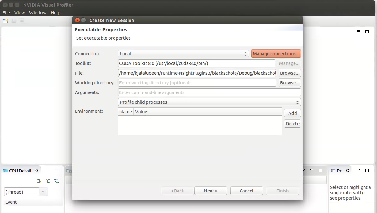 Nsight Eclipse Edition的分析功能基于NVIDIA Visual Profiler (nvvp)代码。Nsight Eclipse插件版将启动Visual Profiler作为外部工具,并携带所选项目的可执行文件及其他信息。