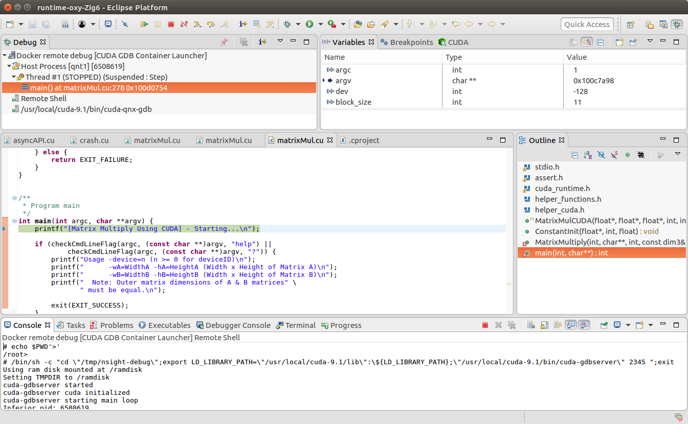 通过Nsight Eclipse,您可以使用运行在主机上Docker容器内的CUDA GDB远程调试目标设备上运行的应用程序。主机上必须已安装包含CUDA GDB和CUDA工具包的Docker镜像。远程机器必须可通过SSH访问,且目标机器上必须安装CUDA工具包。