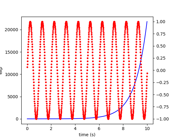 一个常见的需求是为左、右 y 轴设置两个刻度,这可以通过使用 twinx() 实现(虽然目前不支持两个以上的刻度,但这在愿望清单上)。这工作得相当好,尽管在尝试交互式平移和缩放时有一些小问题,因为两个刻度不会同时接收到信号。