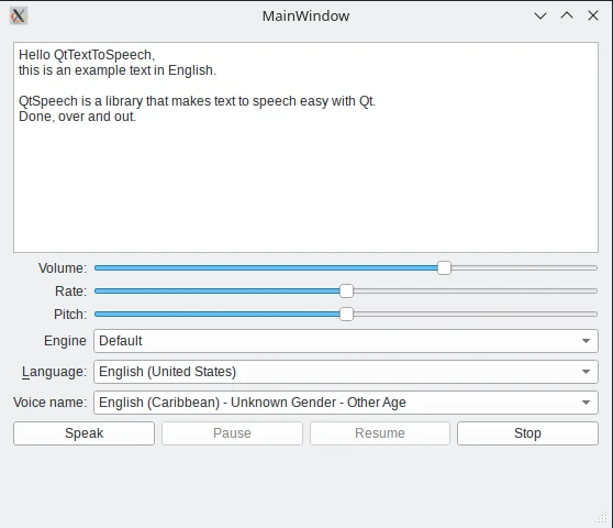 Hello Speak 示例演示了如何在 Qt C++ 应用程序中使用 QTextToSpeech 来朗读文本并控制语音。