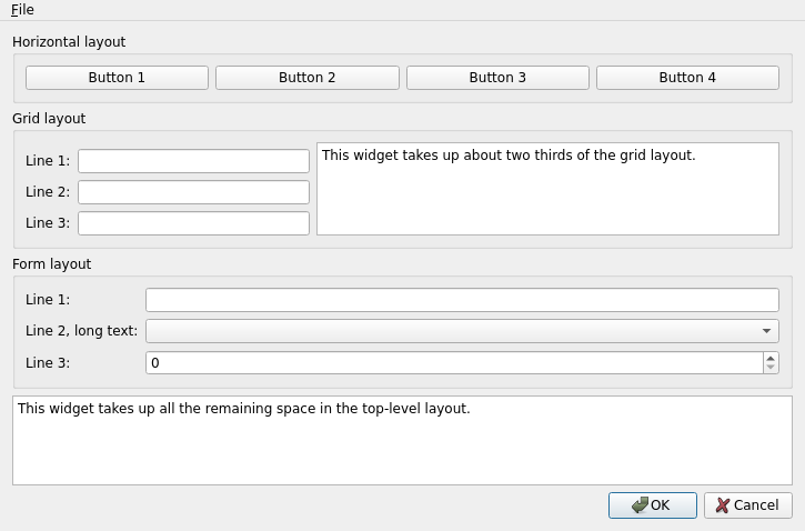基本布局展示了如何使用Qt Widgets中可用的标准布局管理器:QBoxLayout、QGridLayout和QFormLayout。