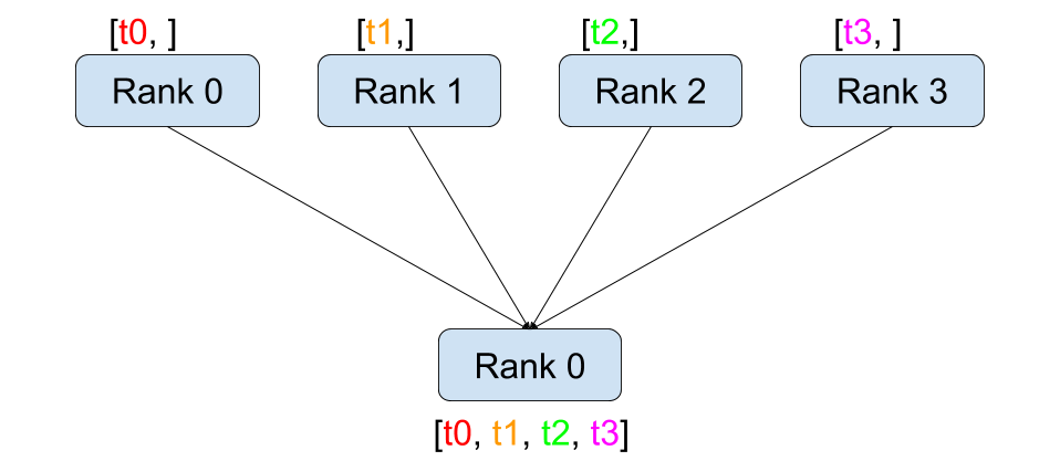 dist.broadcast(tensor, src, group): 将tensor从src复制到所有其他进程。dist.reduce(tensor, dst, op, group): 对每个tensor应用op并将结果存储在dst中。dist.all_reduce(tensor, op, group): 与reduce相同,但结果存储在所有进程中。dist.scatter(tensor, scatter_list, src, group): 将 \(i^{\text{th}}\) 张量scatter_list[i]复制到 \(i^{\text{th}}\) 进程中。dist.gather(tensor, gather_list, dst, group): 从dst中的所有进程复制tensor。dist.all_gather(tensor_list, tensor, group): 将tensor从所有进程复制到tensor_list,在所有进程上。dist.barrier(group): 阻塞group中的所有进程,直到每个进程都进入此函数。dist.all_to_all(output_tensor_list, input_tensor_list, group): 将输入张量列表分散到组中的所有进程,并返回输出列表中收集的张量列表。