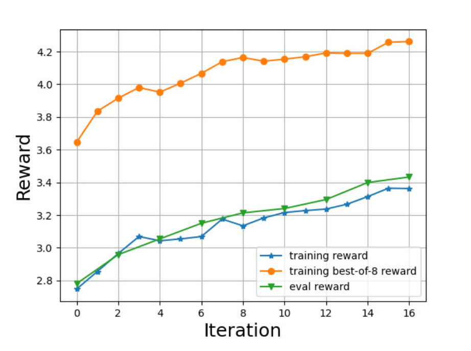 下图展示了RAFT的奖励曲线(注意我们使用较低的温度值测试模型,因此评估奖励较高):