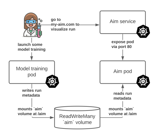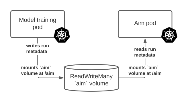 使用K8S卷存储Aim运行记录的核心优势在于,其他K8S部署可以挂载同一个卷并在其上存储运行记录!这样,核心Aim K8S部署就能读取新的运行记录,并将其展示给想要可视化结果的用户。例如,可以设置一个执行模型训练并记录Aim运行的部署,该部署使用与Aim部署挂载相同的卷!该模型如下图所示: