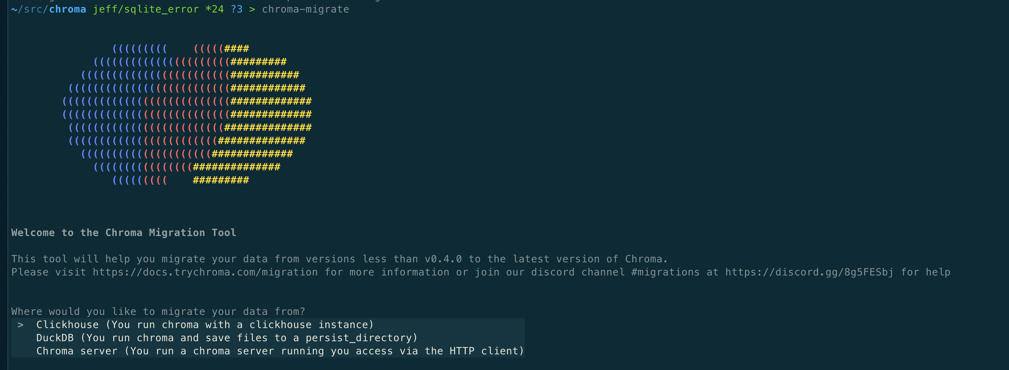 chroma-migrate以升级您的配置。有关更多信息,请参阅 https://docs.trychroma.com/deployment/migration 或加入我们的 Discord 寻求帮助:https://discord.gg/8g5FESbj!