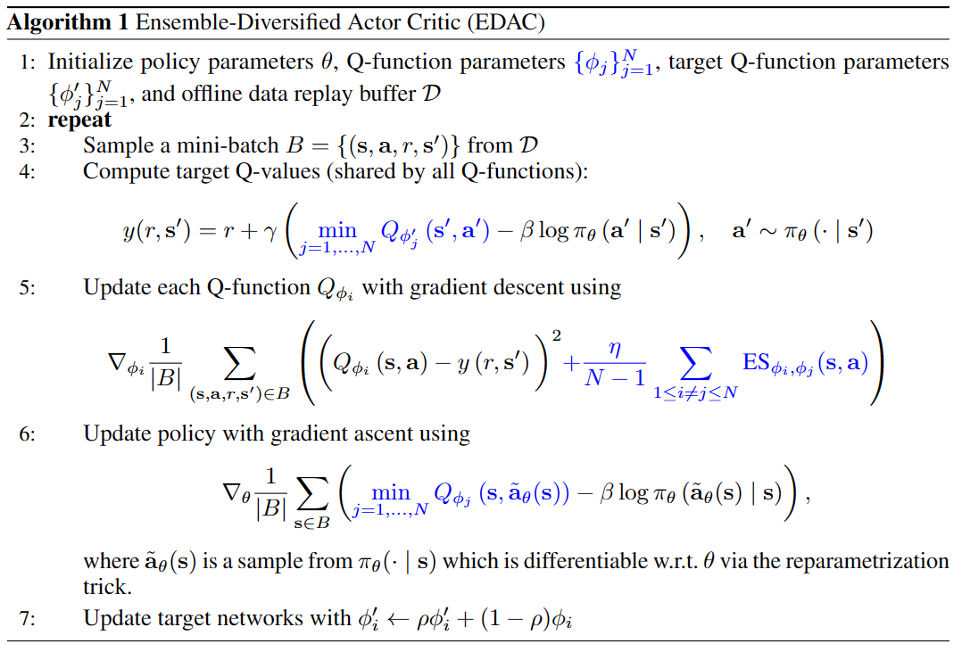 EDAC 表明,通过增加 Critic 的数量,可以通过截断 Q 学习(clipped Q-learning) \(min_{j=1,2}Q(s,a)\) 来惩罚 OOD 操作。 因此,EDAC 可以通过在标准 SAC RL 算法上集成 Q 网络并添加惩罚项来惩罚 OOD 操作来实现。
