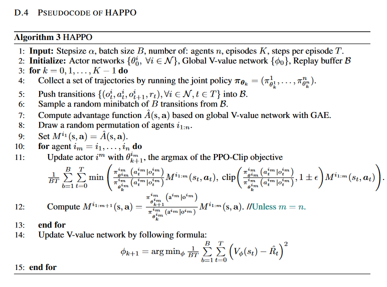 其中 \(\frac{\hat{\pi}^{i_m}(a^{i_m}|s)}{{\pi}^{i_m}(a^{i_m}|s)}\) 和 PPO 类似,为智能体 \(i_{m}\) 新旧策略 ratio; 而 \(M_{\mathbf \pi}(s,\mathbf{a})=\frac {\bar {\mathbf \pi }^{i_{1:m-1}}(\mathbf{a}^{i_{1:m-1}}|s)}{\mathbf{\pi}^{i_{1:m-1}}(\mathbf{a}^{i_{1:m-1}}|s)} \cdot A_{\mathbf{\pi}}(s,\mathbf{a})\) , 其中 \(A_{\mathbf{\pi}}(s,\mathbf{a})\) 是联合优势函数, \(\frac{\bar {\mathbf \pi }^{i_{1:m-1}}(\mathbf{a}^{i_{1:m-1}}|s)}{\mathbf{\pi}^{i_{1:m-1}}(\mathbf{a}^{i_{1:m-1}}|s)}\) 为智能体 \(i_{1:m-1}\) 新旧联合策略的 ratio。