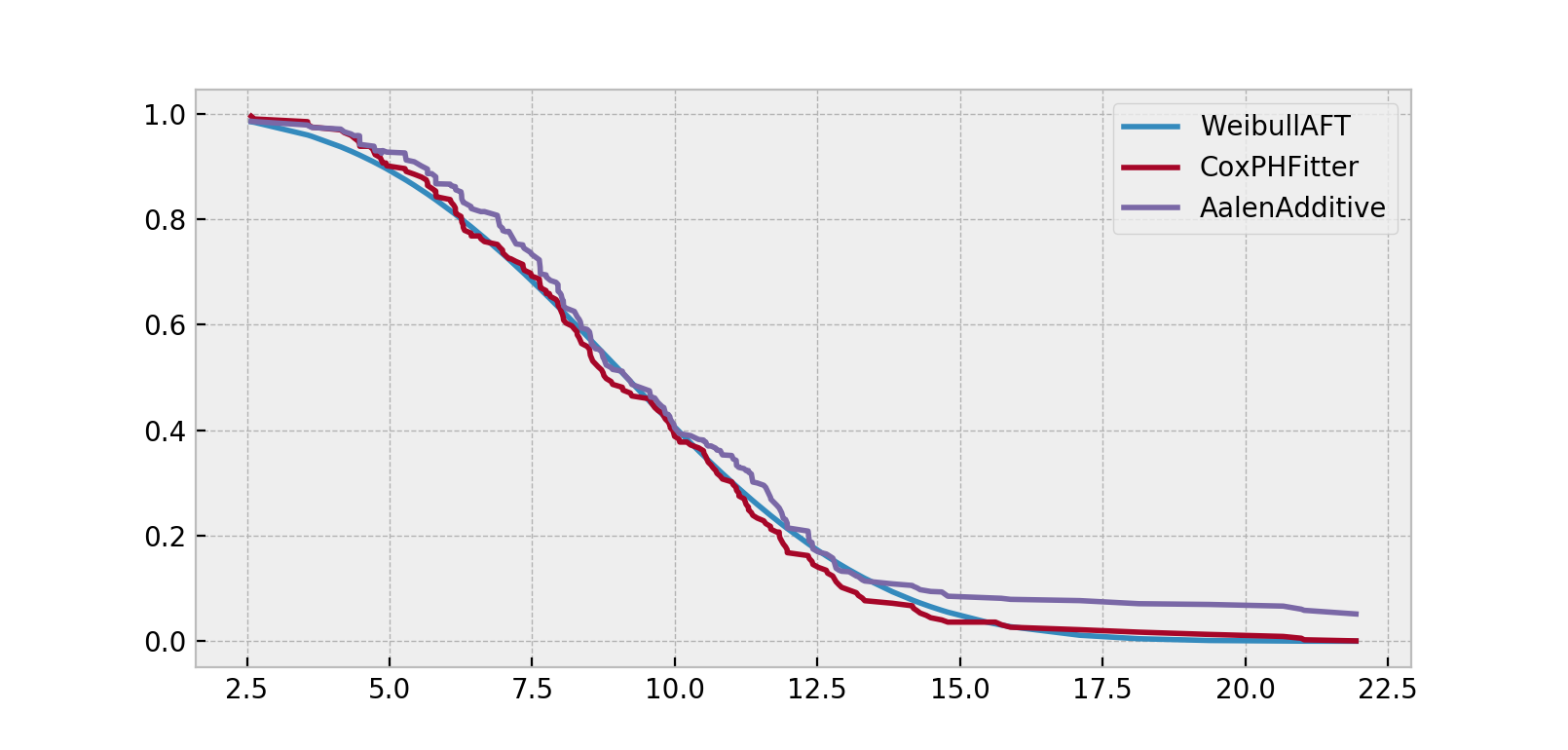 其他AFT模型也可用,请参见这里。另一种回归模型是Aalen的加性模型,它具有随时间变化的危险: