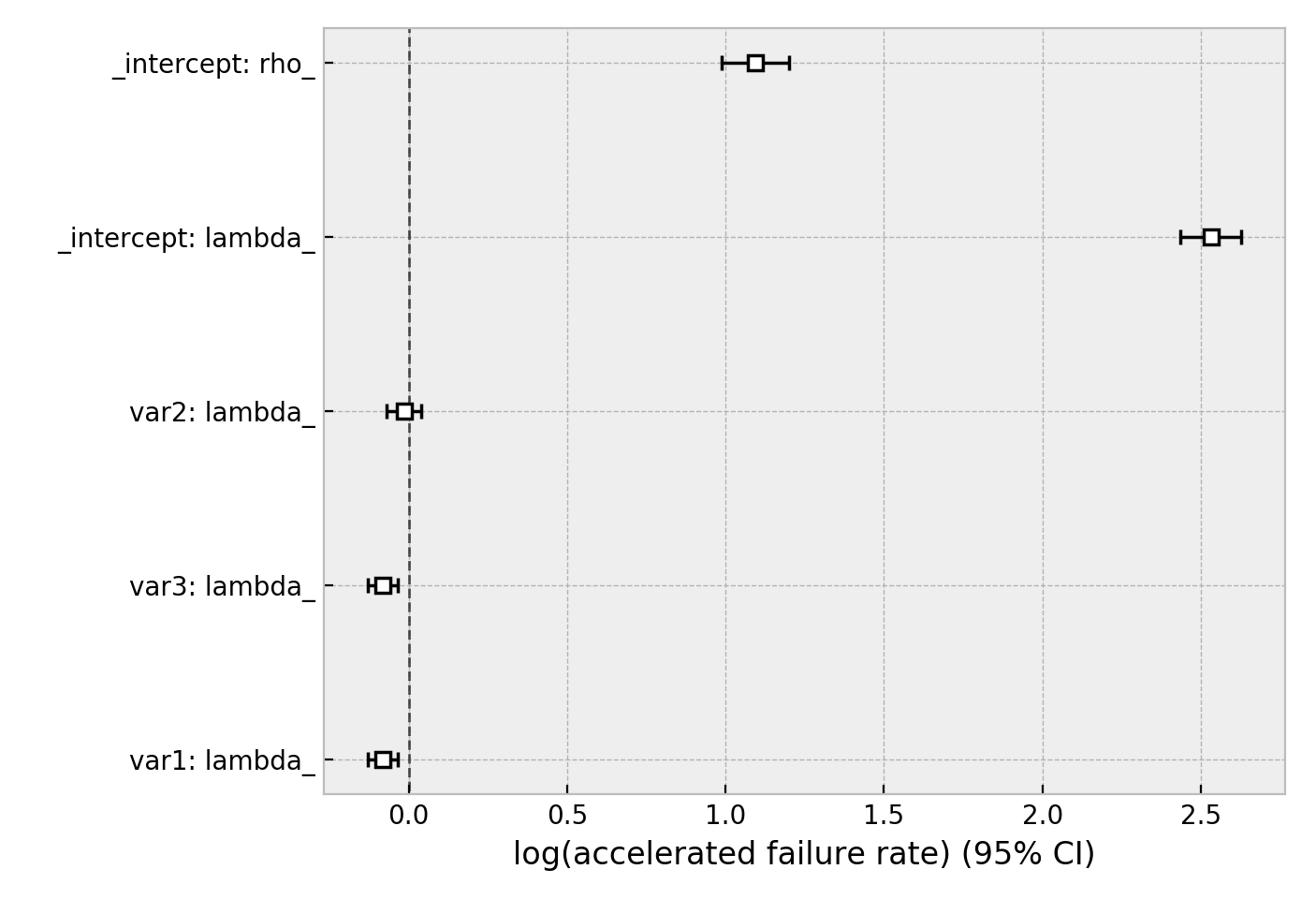 相同的数据集,但使用了威布尔加速失效时间模型。该模型有两个参数(参见文档这里),我们可以选择使用我们的协变量来建模这两个参数,或者只建模其中一个。下面我们只建模尺度参数,lambda_。