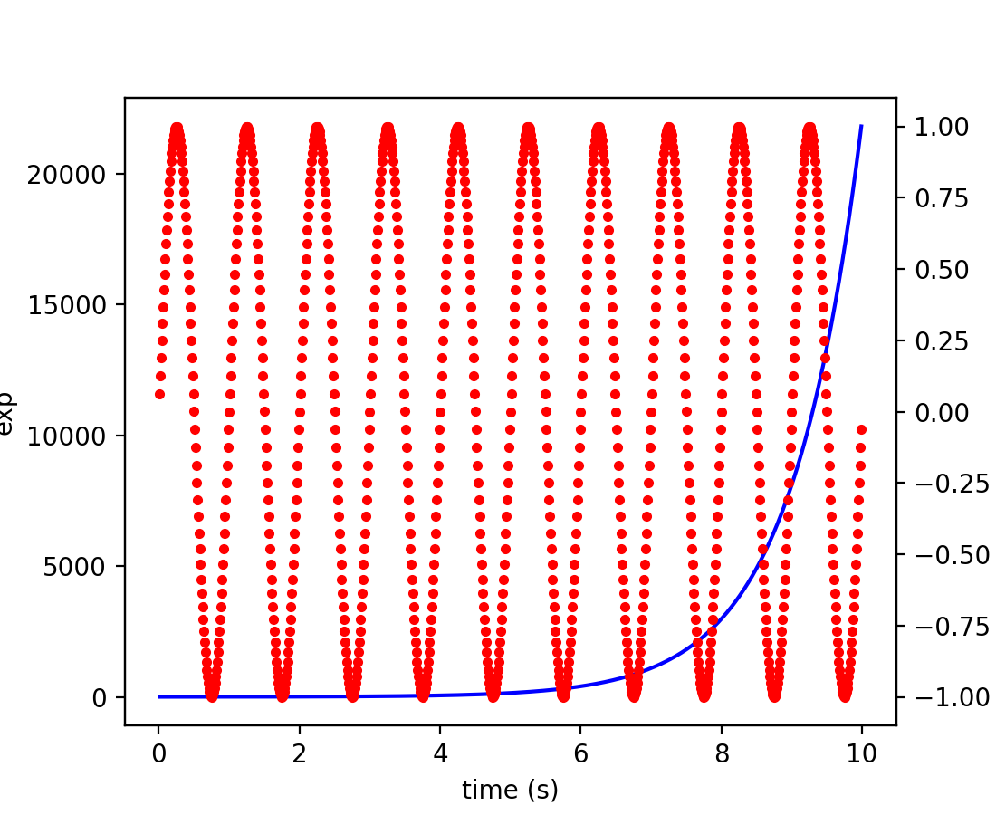 一个常见的需求是为左、右 y 轴设置两个刻度,这可以通过使用 twinx() 实现(虽然目前不支持两个以上的刻度,但这在愿望清单上)。这工作得相当好,尽管在尝试交互式平移和缩放时有一些小问题,因为两个刻度不会同时接收到信号。