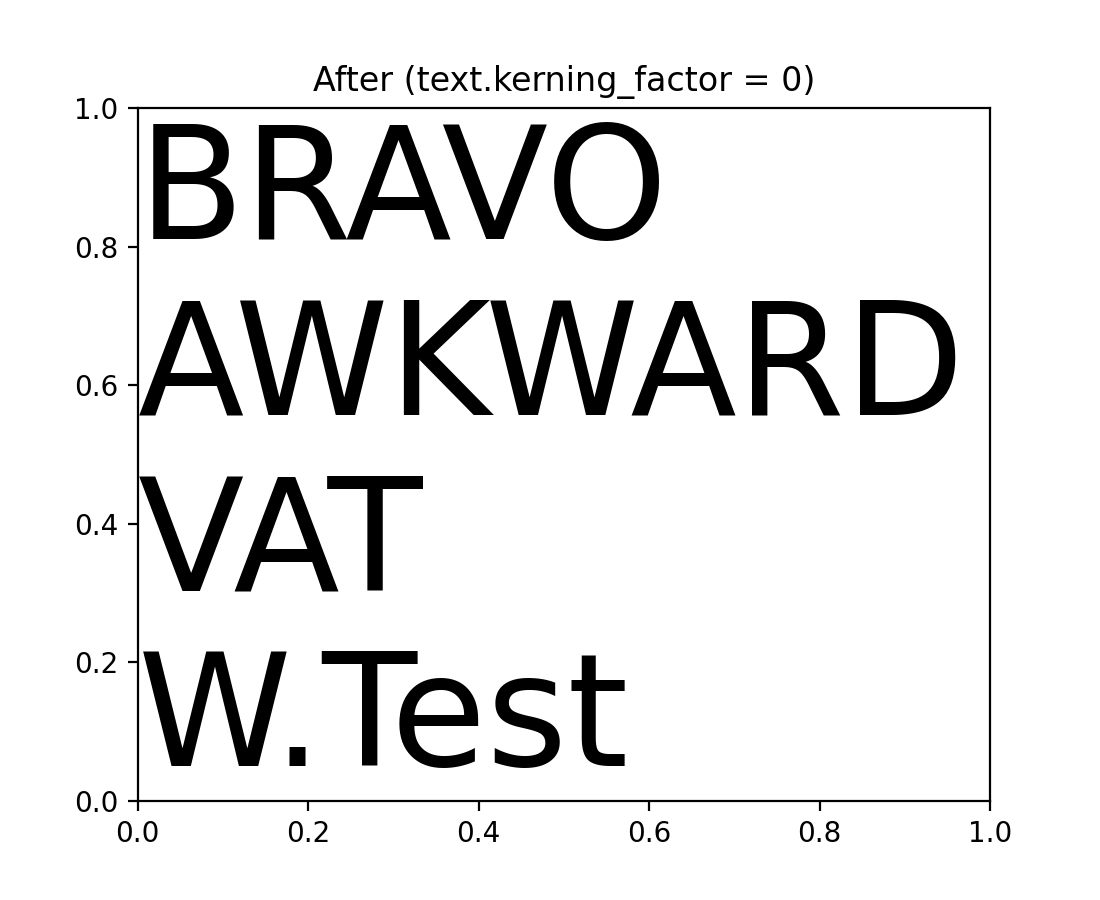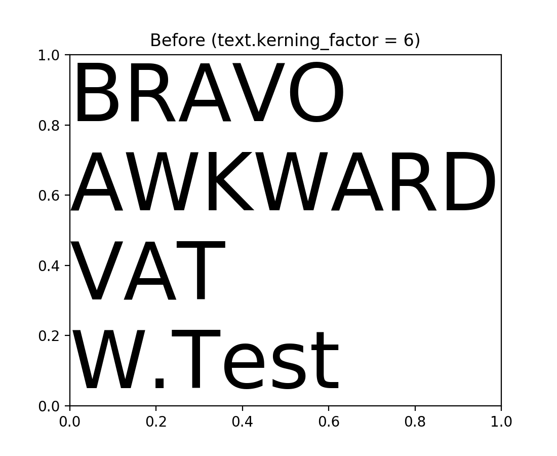 由于字距调整应用方式的错误,Matplotlib 的先前版本会欠纠正字距。此版本现在将正确应用字距(对于 FreeType 支持的字体)。要恢复旧行为(例如,用于测试图像),您可以将 rcParams["text.kerning_factor"] (default: 0) 设置为 6(而不是 0)。其他值的行为未定义。