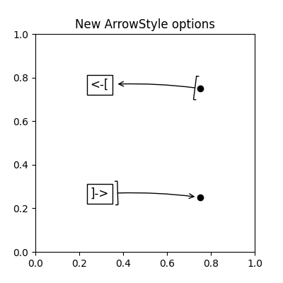 通过此机制,还添加了两种新样式 ']->' 和 '<-['。ConnectionPatch 通过其 arrowstyle 参数接受箭头样式,也接受这些新样式。