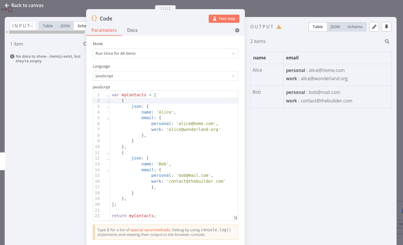 现在您已经熟悉了n8n的数据结构,可以使用它来创建自己的数据集或模拟节点输出。为此,请使用Code节点编写JavaScript代码,按照以下结构定义您的对象数组:
