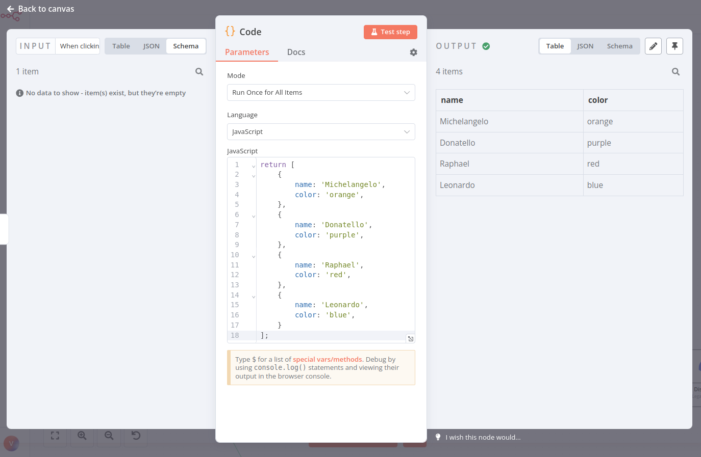 就像你可以使用表达式来引用其他节点的数据一样,你也可以在代码节点中使用一些方法和变量。
