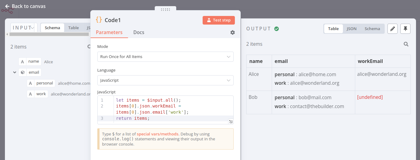 - Use the Code node to write JavaScript functions to modify the data structure of incoming data using the Run Once for All Items mode: