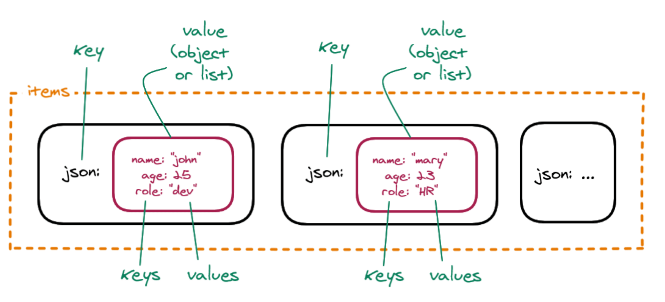 从一个节点发送到另一个节点的数据以JSON对象数组的形式发送。此集合中的元素称为项。