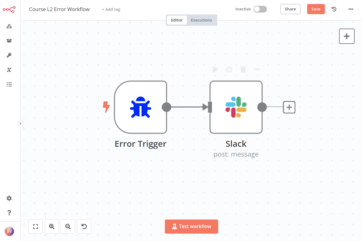 在您的错误工作流中使用其他有意义的节点,例如通过电子邮件或Slack发送有关失败工作流及其错误的通知。