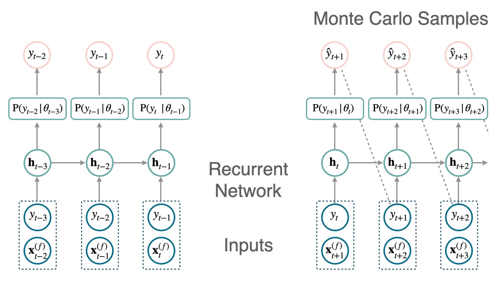 DeepAR模型基于自回归递归神经网络(RNN)在面板数据上通过交叉学习优化生成概率预测。DeepAR利用马尔可夫链蒙特卡洛采样器获得其预测分布,条件概率如下: \[\mathbb{P}(\mathbf{y}_{[t+1:t+H]}|\;\mathbf{y}_{[:t]},\; \mathbf{x}^{(f)}_{[:t+H]},\; \mathbf{x}^{(s)})\]