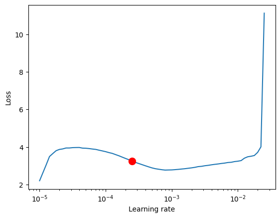 res = Tuner(trainer).lr_find(net, train_dataloaders=train_dataloader, val_dataloaders=val_dataloader, min_lr=1e-5)