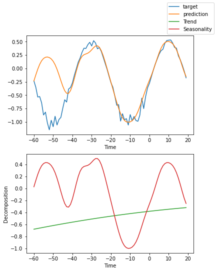 我们可以要求PyTorch Forecasting使用plot_interpretation()将预测分解为季节性和趋势。这是NBeats模型的一个特殊功能,只有其独特的架构才能实现。结果显示,似乎有很多方法可以解释数据,而算法并不总是选择直观上有意义的方法。这部分是因为我们训练的时间序列数量较少(100个)。但也是因为我们的预测期没有覆盖多个季节性。