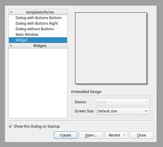 你会看到一个对话框来选择基础窗口:一个 QWidget、一个 QMainWindow 等。