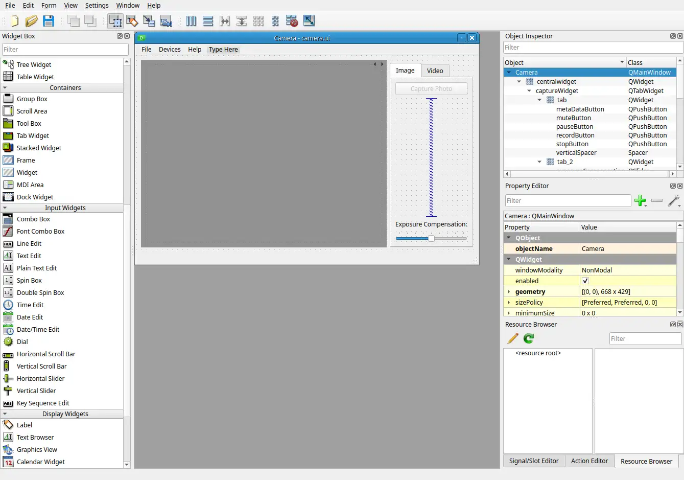 在前面的截图中描述了您可能使用的区域的简单区分。在1部分,您将找到可以在应用程序中使用的所有元素,这是2区域。应用程序设计遵循分层配置,在3中,您可以看到示例的结构,其中仅包含一个QMainWindow和一个QPushButton。最后,您可以在4中访问和修改项目的属性,在那里您可以调整尺寸、名称等。