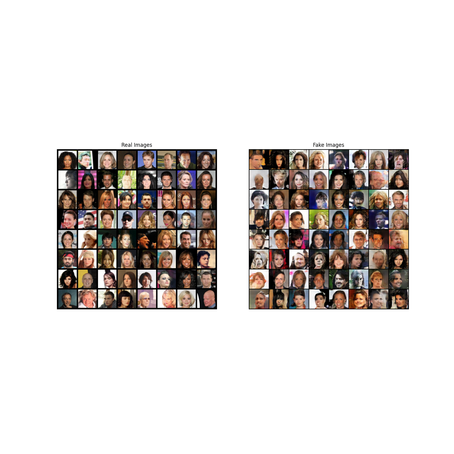 最后,让我们检查一下我们的表现。在这里,我们将查看三个不同的结果。首先,我们将看到D和G的损失在训练期间如何变化。其次,我们将可视化G在每个时期对fixed_noise批次的输出。第三,我们将查看一批真实数据与G生成的一批假数据。