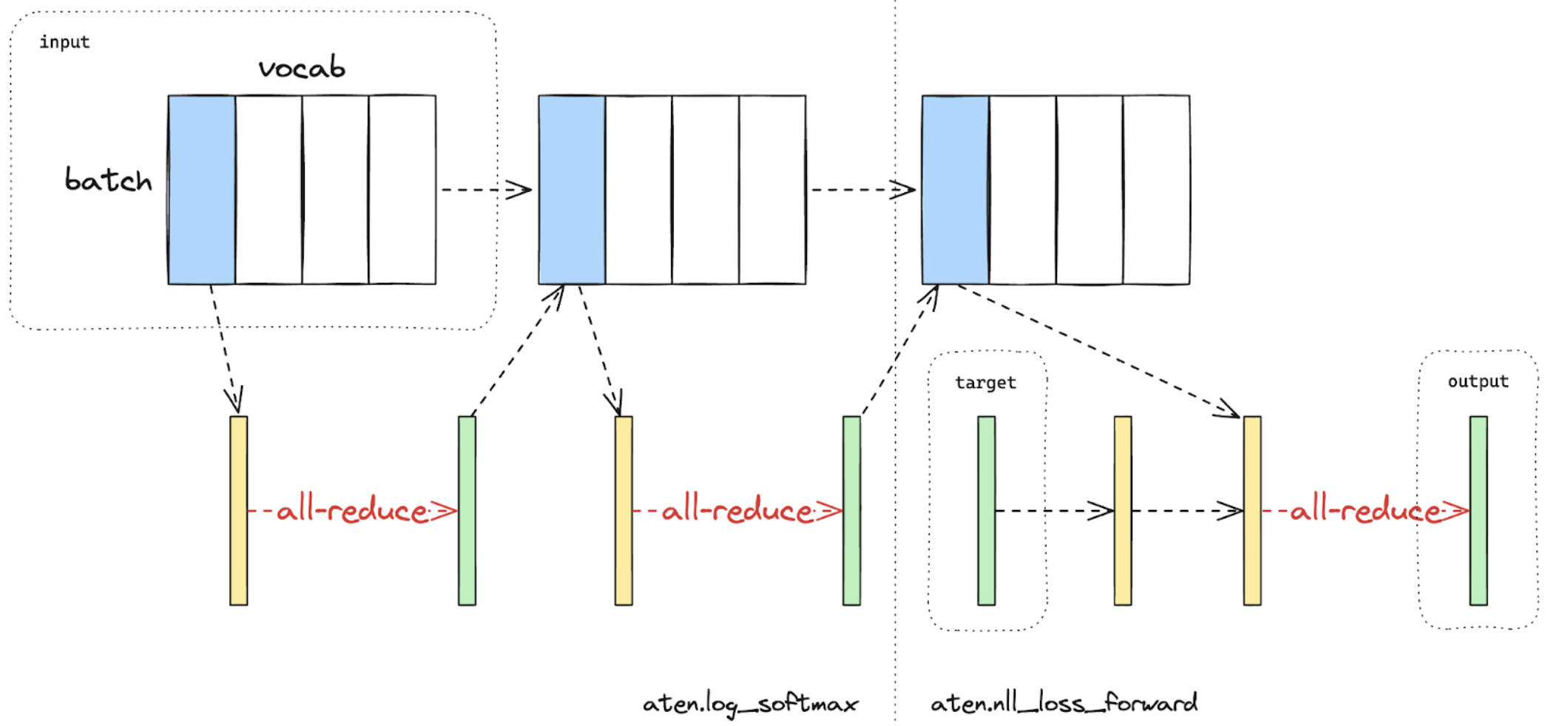 图2. 在一个GPU上并行计算交叉熵损失的前向传播。蓝色表示分片张量;绿色表示复制张量;黄色表示具有部分值的张量(待全归约)。黑色箭头表示本地计算;红色箭头表示GPU之间的功能集合。¶
